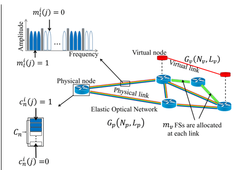 Here, VONs can be constructed over EON by using virtualization technology. For general physical networks, virtual networks can be constructed based on a user’s request about network topology and network resources such as CPU, memory, and bandwidth. This virtual network construction is performed by mapping requested resources to the available node and link resources in a physical network. On the other hand, for the construction of VON over EON, requested resources have to be mapped to available FSs in a VON. Hence, the spectrum contiguity constraint has to be constrained. Moreover, if wavelength conversion is not allowed, the same FSs have to be utilized along all virtual links in a VON.