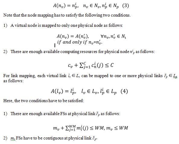 Moreover, a VON will be constructed if the requested virtual nodes can be mapped to the physical nodes (node mapping) and virtual links to the physical links (link mapping). In node mapping, if virtual node nv ∈ Nv is mapped to a physical node nip ∈Np, this mapping is denoted as