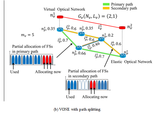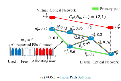 Thus, the path splitting is effective for the construction of virtual networks. However, path splitting cannot be utilized for VON over EON. Moreover, the spectrum splitting can be used for the lightpath establishment in EON, but it cannot be used for VON.
