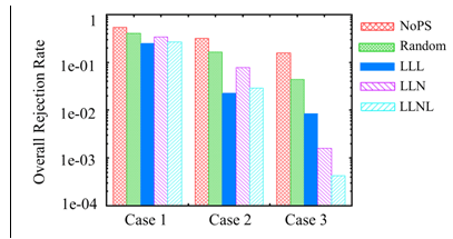 Finally, we investigate how the maximum number of FSs per request affects the overall rejection rate for the proposed four schemes and the scheme NoPS. Figure 9 illustrates the case of NSFNET. We set the maximum number of FSs per link is set to 32, 16 and 10 for case 1, case 2, and case 3, respectively. Moreover, we consider the case where the arrival rate is 60 requests per millisecond. Figure 9 shows the overall rejection rate for all four schemes in cases 1, 2 and 3. From this figure, we find that the overall rejection rate in case 1 is the largest and is the smallest in case 3 for all schemes. This is because in case 1, the maximum number of FSs per link is large. As a result, VON requests are rejected frequently because there are no available FSs at links. On the other hand, in case 3, the maximum number of FSs per link is small, hence increasing the probability for other VONs to be constructed. Furthermore, in overall, the LLNL shows the best performance in terms of overall rejection rate.