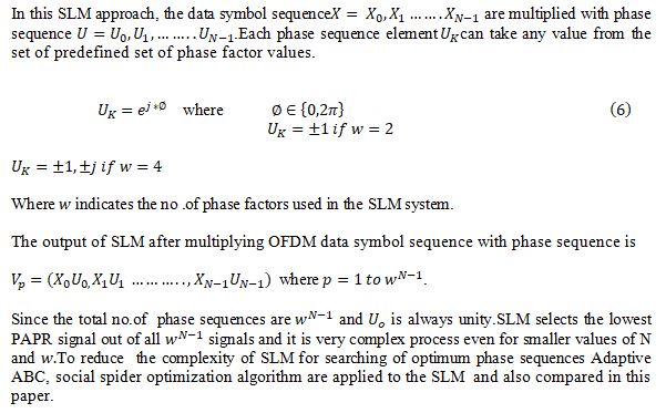Necmi Ta¸spınar et al [12] have declared a method for reducing the complexity of SLM for obtaining best phase sequences to reduce the high PAPR of OFDM signal. In this approach improved ABC algorithm is applied for searching best phase sequences with lower complexity. In this proposed method PAPR performance of OFDM signal is reduced with the lowest complexity.