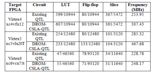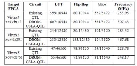 Table.1. Comparison of various performance parameters on different Xilinx FPGA devices for ExistingQTL and DROM-CSLA-QTL method