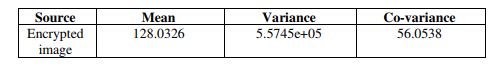 The Table 2 tabulates the mean, variance and covariance performances for encrypted image.