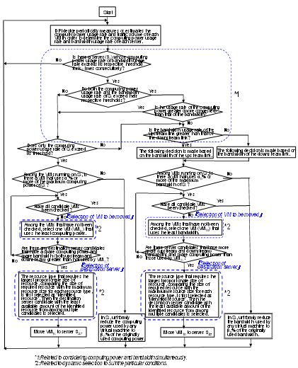 Figure 2 illustrates the control flow of the proposed method for server congestion, which is based on Methods 1-2 and 1-5, and the destination server selection method proposed above. This figure does not contain the processing flow of Step 1. The parts that differ greatly from the existing processing flow in References [4] and [5] are indicated by *1 and *2. *1 is the part where the computing power and the bandwidth are considered simultaneously. *2 is the part where a virtual machine to be moved and the destination server are dynamically selected.