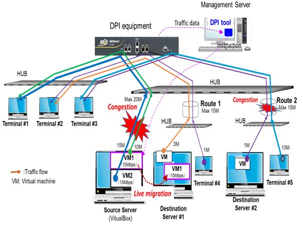 Here we confirm the operation of the proposed method for a case of bandwidth congestion. The evaluation system used is shown in Figure 3. which is an application program we developed, in the DPI management server is modified to suit the proposed congestion flow in Figure 2. The DPI equipment device is Net Enforcer AC-502 [13] from ALLOT Communications. Virtual Box [14] is used to implement virtualization. Both VM1 and VM2 operating on the source server communicate with terminal #1, and the traffic volumes of VM1 and VM2 are 10 Mbps and 15 Mbps, respectively. It is assumed that the access bandwidth of the source server is congested in this example. The VM running on destination server #1 and terminal #4 are both communicating with terminal #2.Both the VM running on destination server #2 and terminal #5 communicate with terminal #3. Traffic from the destination server #1 and terminal #4 go through Route 1, and the traffic on destination servers #2 and terminal #5 go through Route 2.It is assumed that Route 2 is congested in this example. All communication passes through the DPI device. The DPI tool, which is an application program we developed, in the DPI management server collects traffic data from the DPI device and instructs the live migration of a virtual machine (VM) to the source server and destination server #1, according to the control flow in Figure 2. Live migration is executed by sending a live migration command of Virtual Box from DPI tool to both the source server and the selected destination server with Ps Exec [15] from Microsoft.