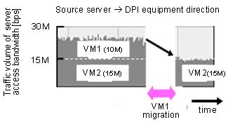 It is examined whether the evaluation system operated as expected by the proposed method. Since there are two candidates (VM1 and VM2) for a virtual machine to be moved, two destination server candidates (servers #1 and #2) and two route candidates (Route 1 and Route 2), there are eight combinations. Operational conditions of these eight combinations were set up and it was confirmed that they all operate correctly. Figure 4 illustrates the case where VM1 is selected and access bandwidth at source server is decreased from 25Mbps to 15Mbps (as a result, the access bandwidth congestion at source server is alleviated).