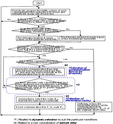 Figure 6 illustrates the control flow of the proposed method for line congestion which is based on Methods 2-1 and 3-1. This figure does not contain the processing flow of Step 1. The parts that differ greatly from the existing processing flow are indicated by *1 and *2. *1 is the part where the communication flow to be diverted and the route to which the communication flow to be diverted are selected dynamically. *2 is the part where the maximum allowable network delay is considered in the selection of communication flow and alternate route.