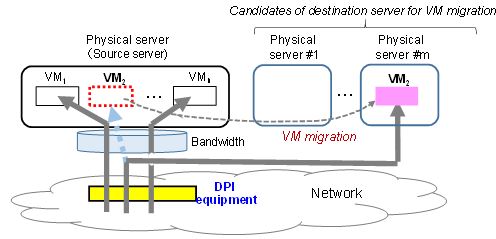 Considering these advantages of using DPI, the authors previously proposed a congestion control method that works as follows [4],[5]. The CPU usage rate of each server is estimated by installing, in a network, a DPI device which constantly monitors the number of simultaneous TCP connections to each server. When the congestion of computing power is detected, it is resolved by moving virtual machines to other servers. In addition, the usage rate of server access bandwidths is estimated by using the DPI device, which constantly monitors the usage rate of bandwidth and application types used by each virtual machine in each server. Furthermore, the DPI device constantly monitors the volume of traffic and application types on each line in the network. If any line congestion is detected, the congestion is resolved by diverting some communication flows on that line to other lines or routes.