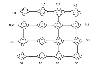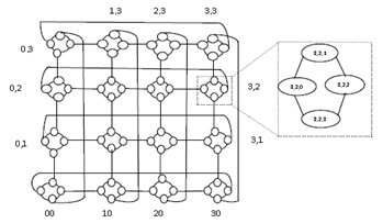 TCR can be scalable in two levels. The first layer is ring topology which has four connected nodes. This ring can be treated as a super-node, which can improve the overall performance of the system by enhancing local characteristics of the system. The torus can be called as the next level of the network where super nodes are connected. TCR of 64 nodes is depicted in Fig.2 which consists of 4×4 connected super-nodes. The coordinates of any node in the topology can be represented by three positions. For example node A (x, y, z) represents the position of the torus in x and in y-direction and third coordinate z represents the position number within a ring which has ranged from 0 to 3. In other words, the first coordinate depicts a position along X axis;the second coordinate depicts a position along the Y axis and the third one is the node number within the ring which starts from left to right. For example node (2, 2, 0) indicate 0th node of the ring of super-node present at the position (2, 2).