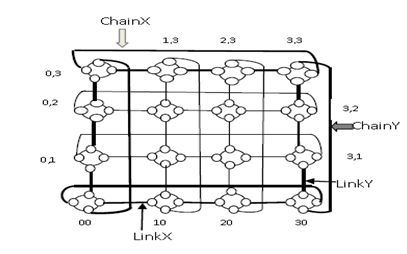 The path of the message is computed from the difference between positions of both source and destination. This position difference between source and destination gives the number of hops/links in between them. So, accordingly, the chained link, LinkX or LankY are selected. The static routing chooses the shortest path from the source to the destination. The dynamic routing selects the alternate path to the destination in case of link or node fault.