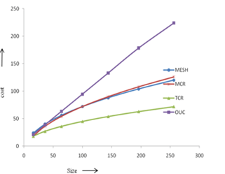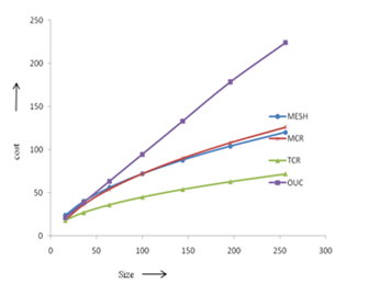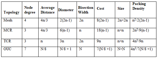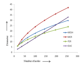From table 1 and 2, it is observed that the diameter, average distance of TCR is less than MCR and OUC and bisection width of TCR is more than MCR but less than OUC. As more number of links are present in OUC and the degree of the router is 7 so, the cost and complexity of router is more. As the bisection width of OUC is more, so the network will be less congestion than other topologies under consideration. The cost of OUC is highest amongst all topologies under consideration. The network diameter has a direct impact on communication overhead [7]. The communication latency is less for small diameter of a topology. The diameter analysis is illustrated in Fig.5. For small size network, the diameter of OUC is small among all topologies