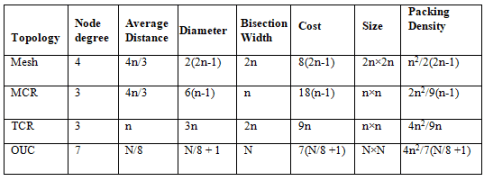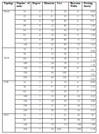 The performance analysis of TCR topology structure is based upon comparisons of topological properties such as node diameter, average distance, bisection width, and packing density. The diameter of a network affects node latency. The average latency of a network is proportional to the average distance[10]. The bisection width is directly proportional to the throughput. The throughput or a given network topological structure is maximum for the efficient routing algorithm and ideal flow control mechanism [7]. So, the desirable property of any topology is that the network average distance should be minimized as it affects latency in communication, the diameter should more be less and bisection width should be more. The packing density is expressed in terms of the total number of nodes present in a topology per unit cost. The packing density is related to the size of the VLSI chip layout. The higher packing density is the smaller size of the chip design layout.