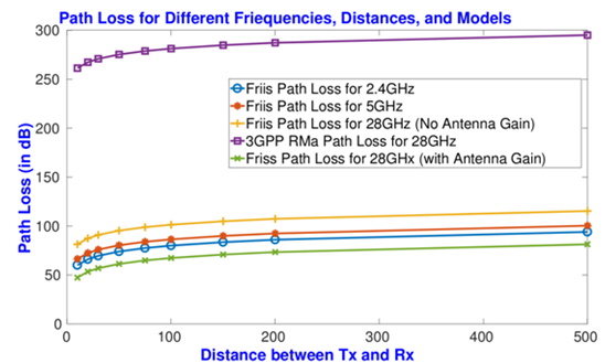 It is clearly proven now that there is no one model that is capable of describing the mmWave channel in different environments and that the transmission scenario conditions need to be taken into consideration when trying to talk about such channel models [12], [14]. The following figure shows some of the propagation path loss for different frequencies and distances according to some of the previously described models:
