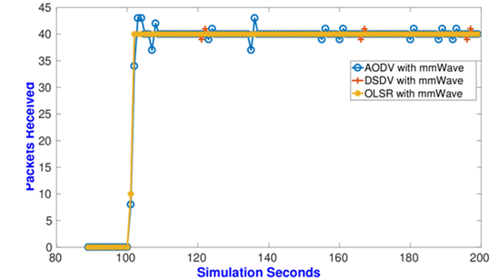 Figure 3. Packets Received for different mmWave MANET (with RMa Channel Model) Routing Protocols.