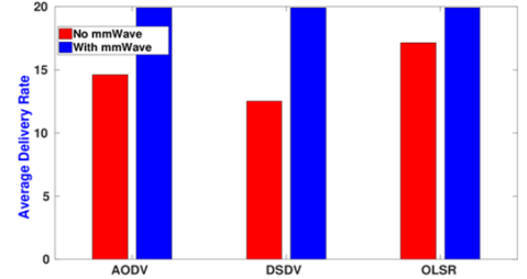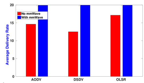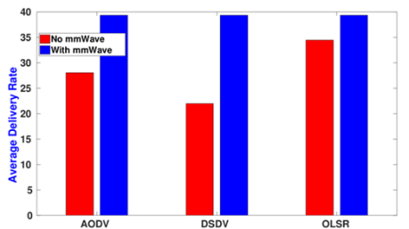 Figure (4) is showing a comparison of the average packet delivery ratio between different routing protocols with mmWave versus the same protocols with traditional sub-6GHz frequency bands.
