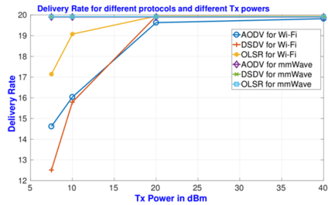 The final step in our investigation for the mmWave in MANET, is the effect of transmission power on the delivery ratio. It is well known that for broadcast wireless channels, increasing the power would reduce the effect of path loss because of interference and attenuation, but for the directional beams of mmWave, less power should be enough to perform the same. According to the recent FCC in [15], the highest UE effective isotropic radiated power (EIRP) is 43dBm (almost 20 watts). So, we studied the effect of increasing the Tx power of the UE’s on the delivery rate of the data packets for different routing protocols in ad-hoc networks and the results shown in figure 10 are as expected, showing that mmWaves are doing better than traditional Wi-Fi frequencies even with less Tx power: