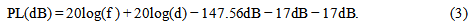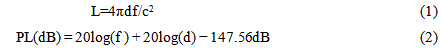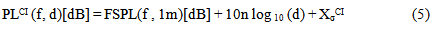 where n denotes the single model parameter, the path loss exponent (PLE), with 10n describing the path loss in dB in terms of decades of distances beginning at 1m, d is the separation distance between the transmitter and receiver nodes, XσCI is the SF standard deviation describing large-scale signal fluctuations about the mean path loss over distance, and FSPL(f, 1m) denotes the free space path loss in dB at the transmitter-receiver separation distance of 1m at the carrier frequency f . Also, the free space path loss (FSPL) can be described as: