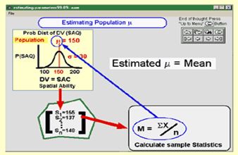 Figure 1 shows an overview of all the relationships. In step 1, in the upper left-hand corner of Figure 1, Sampling Distribution of the Mean (SAQ) is conducted as a normal distribution. In step 2, we do a research project on spatial ability. This is equivalent to taking a sample of size(n)from this population of SAQ scores. So, in step 3 a statistic on the sample data is calculated. Hence, we calculate the mean [6].