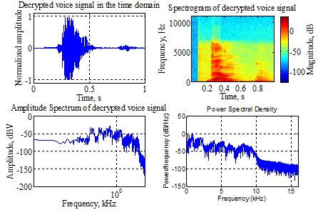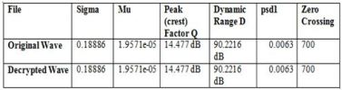 The most popular characteristics of the wav file are calculated for the original file and the decrypted one and they are always the same. Table 2 shows sample: