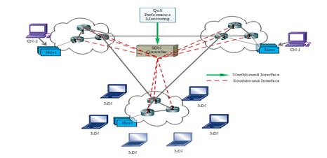 In our proposed architecture there are three networks. Each network consists of three routers and three users or hosts connected with each other. In every network, the routers are interconnected with each other. Three networks are connected with the SDN controller, which is QoS performance monitor also. After interconnecting the routers of each network, the network will be connected to each other. By interconnecting these networks, all hosts and routers will be interconnected with themselves.