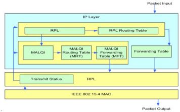 Considering the overall operating model for the proposed MALQI based IP layer packet forwarding path is depicted in Fig. 1. In this figure IP layer, its interface with the link layer and RPL can be visualized precisely