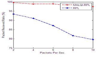 In this test case, our proposed Multiple Constraints Adaptive Link Quality Index (MALQI) based mobile-RPL routing protocol, as well as the native RPL routing protocol, were examined for respective efficiency for mobile routing purpose over LLNs. MALQI considers ETX as well as adaptive (i.e., current) RSSI of a node to decide best parent node for forwarding path selection. On the contrary, native RPL considers ETX as the sole objective function for parent selection. Fig. 3 presents the performance of the proposed routing protocol in terms of packet delivery ratio (PDR) when the varying number of packet transmission or payload. Looking into the results (Fig. 3), it can be found that the proposed MALQI-RPL routing model exhibits almost or near 100% throughput, on the contrary, native RPL under mobility exhibits relatively lower PDR. Here the prime reason of reduced PDR can be the parent node selection issue. No doubt, with generic or native RPL there could be delay in identifying best parent node and forwarding path, this as a result could lead data drop. Proposed MALQI routing model initiates node discovery once identifying the fault or link outage, in that case since the proposed routing model encompasses parent set table and initially identifies best RPL node for alternate path formation. Due to this robustness, MALQI avoids transient node discovery and hence achieves low latency or delay (Fig. 8). Consequently, it helps in forming an alternate forwarding path swiftly and hence provides higher throughput. In major communication scenario, especially for real-time applications there used to be varying payload, and hence adaptive a best forwarding path to carry the at-hand packets or load is the must. We have examined the performance of MALQI-RPL routing protocol by varying packets per second. Here, we have examined relative PDR by varying packet rate (i.e., 1 packet/sec, 2 packets/sec, 4 packets/sec, 8 packets/sec and 10 packets/sec). Observing Fig. 4, it can be visualized that the proposed MALQI-RPL based routing model exhibits higher PRR than the native RPL. The result depicts that the proposed mobile-RPL routing model is capable of sustaining higher PRR even under increasing packet rate. Here, not only the efficacy of multiple constraints and adaptive RSSI (say, current link quality) based best parent selection and path formation technique strengthen the proposed routing model, but also the link quality adaptive mobile node positioning enables optimal node movement. This consequently enables efficient data gathering and the consideration of adaptive link enables reliable communication to assure low packet loss and hence higher PRR.