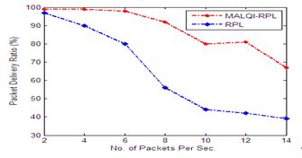 Fig. 5 presents PDR performance while varying packet injection rate or number of packets variation. Due to mobility in LLNs there can be dynamic network parameter variations, topological changes and link variation causing link outage and data loss. Since, in our research we emphasized on assuring minimum data loss even under mobility or link-outage probability, our proposed MALQI-RPL routing protocol has accomplished anticipated performance. Fig. 6 confirms that the proposed routing model is capable of delivering optimal packets to the destination while ensuring minimal packet loss, even under varying payload or packet injection rate. This is because of the link adaptive parent node selection and swift best forwarding path selection.