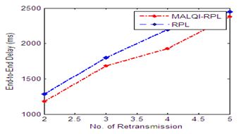 For any QoS or QoE centric communication requirement, maintaining minimum latency or end-to-end delay is must. The simulation result as presented in Fig. 8 confirms that the proposed MALQI-RPL based routing protocol performs better time efficient best route formation and data transmission. Here, the delay efficiency is because of enhanced swift best parent node selection