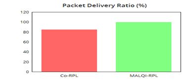 Fig. 9 presents the PDR performance comparison between the proposed MALQI-RPL routing protocol and Co-RPL protocol for mobility based LLNs. As depicted in Fig. 9, it can be visualized that the proposed MALQI-RPL protocol exhibits more PDR than the Co-RPL. This can be due to the multiple constraints, particularly adaptive link quality-based parent node selection and forwarding path selection. Additionally, the impact of adaptive RSSI based mobile node positioning can’t be ignored to have influence of enhanced PDR over the existing system.