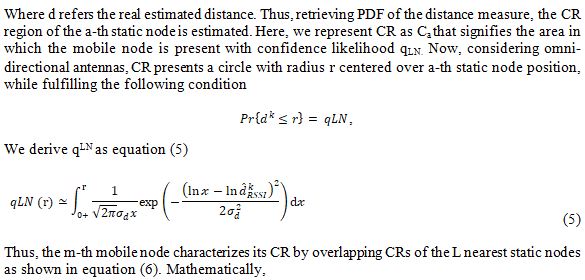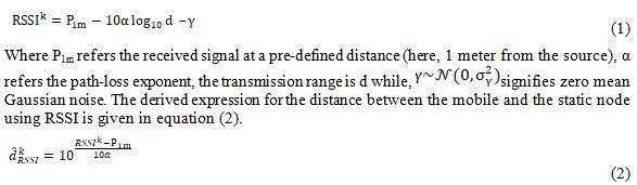 This section primarily discusses the mobile node positioning under a mobility condition. In our research, we use dynamic RSSI of an anchor node to perform mobile node positioning. The prime reason of the selection of this method is that unlike other approaches (for example, least square), it estimates and characterizes the impact of each static or anchor node distinctly. In addition, the RSSI estimates from nearer static nodes influences node positioning significantly in comparison to those estimated from distant static nodes. To create CR, we consider that the mobile nodes are aware of the time-varying channel statistics follows the long-distance path loss model. Here, RSSI at certain instant (say, Kth time slot) is obtained as equation (1).
