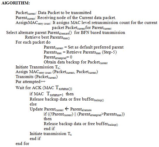 In last few years, numerous research efforts have been made to enhance WSN routing protocols [1-5]; however major efforts either intend to deal with energy enhancement, delay sensitive communication or throughput optimization. However, realizing present day application specific demands (i.e., IoT applications and other communication systems operating under LLN conditions) and QoS, the majorities of the traditional approaches either fail to deliver anticipations or provides single performance parameter optimization. To alleviate existing limitations, recently a routing protocol named Routing Protocol for Low Power Lossy network (RPL) was proposed by Internet Engineering Task Force (IETF) in 2008 [6]. RPL is recognized for its efficacy to enhance performance for LLN applications [7]. Typically, LLNs are defined in terms of high packet loss, path loss, channel fading, multi-path interferences, low connectivity, low power equipment, etc. Practically, WSN is one of the key examples of LLNs. Considering the significance of RPL a few efforts have been made to use it for LLN applications. Native RPL [6], doesn’t have mobility features, and hence to meet the exponentially rising demands mobility aware routing protocol is inevitable. With intend to introduce mobility with RPL a few efforts are made in [8][9]; however, most of the approaches undergo link instability and responsiveness issues due to dynamic topology and network parameters. To ensure the higher performance of a routing model, deciding the best forwarding node (BFN) often plays the vital role. Authors have applied expected number of (control) packet transmission (ETX) as the objective function to perform RPL parent node selection (i.e., resulting the best forwarding path selection). The inefficient BFN selection often results into data drop, delay, and energy exhaustion. On contrary, there are numerous applications where LLN are expected to provide QoS and QoE delivery in a stringent manner while ensuring higher packet delivery ratio (PDR) and low delay. Such expectations might be even at the coarser level or at a fine grain packet level. Applications like threshold crossing alerts, fault or intrusion identification, event detection, burglar alarms, industrial supervision and automation-control, remote healthcare monitoring etc demand higher degree of QoS provision. For example, RPL based healthcare monitoring over LLN signifies a tedious task where there can be mobility of the person whose medical parameters, like electrocardiogram (ECG), pulse rate, temperature etc are being remotely monitored. In such scenarios, the data rates of the order of multiples Kbps may be anticipated to perform health monitoring. IEEE 802.15.4 MAC, a typically applied link layer protocol in RPL-LLNs possesses a built-in ACK mechanism to reduce packet loss during link outage by means of retransmissions. In practice, the highest retransmission count is set-up as 4-5 while retransmission is scheduled at the interval of 10ms. Though it exhibits retransmission well for the transient link outages for the small duration, it is unable to avoid or stop unsuccessful packet transmission, particularly when the wireless channel has significantly high coherence times or receiver node failures.