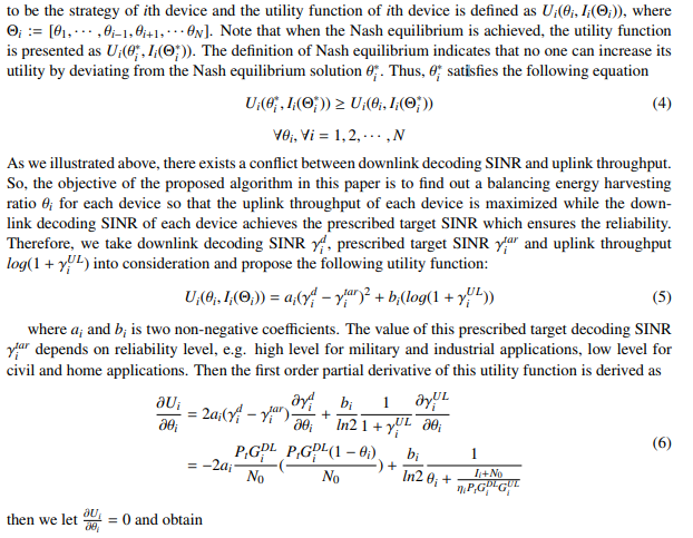 A game model consists of three essential elements: player, strategy and utility function. In this paper, each device is regarded as a player participating in this game. The energy harvesting ratio θi is assumed