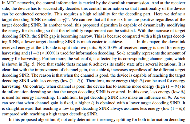 Our solution indicates that in order to ensure the high reliability of MTC, a cell edge machine with poor channel condition utilizes the majority of received energy to do harvesting while a cell center machine with good channel condition utilizes majority of received energy to do information decoding. As a result, the uplink throughput of a cell edge machine is lower than that of a cell centre machine since the harvest-then-transmit protocol is used here. Additionally, the value of target decoding SINR affects the performance of this system as well. When the target decoding SINR increases, the uplink throughput decreases so that more received energy can be used for decoding.
