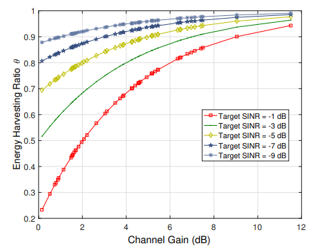 and energy harvesting but also affects the uplink throughput of each device. Fig. 6 shows the effects that θi makes on throughput. As it is discussed before, θi actually represents the amount of energy for harvesting. And all of this harvested energy is used for uplink transmission since there is no battery for energy storage. So it is clear that with the increase ofθi , the throughput increases as well. It is worth noting thatθi varies in different regions under different target decoding SINRs. This is because a device experiencing a poor channel with a high target decoding SINR has to utilize more received energy to reach this target decoding SINR compared with a device experiencing a poor channel with a low target decoding SINR. This explains the starting points locations of these five lines. Additionally, for the devices with good channels, regardless of the target decoding SINRs, all these five lines achieve similar throughput. This is because for a device with a good channel, the target decoding SINR can be easily achieved by consuming little-received energy. As a result, most of the received energy is used for uplink transmission. Therefore, they are capable of achieving the same throughput. This explains the endpoints locations of these five lines.