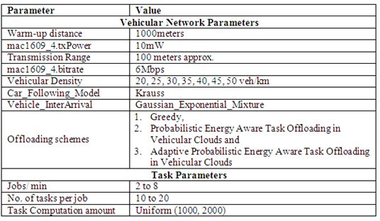 • Probabilistic Energy-Aware Task Offloading in Vehicular Clouds (PEATOVC): This considers the task energy consumption in scheduling tasks to sacrifice successful task completion rate. This means less number of tasks are successfully scheduled to save energy.
