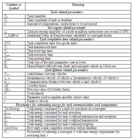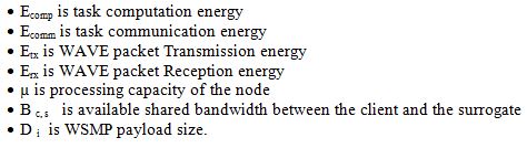 • Though the task communication time is a smaller portion of the task completion time it influences the reliability of the scheduled task. Hence, to select highly reliable surrogates the nodes with the longest link lifetime should be selected. In the case of vehicular ad hoc network, the nodes with the least relative velocity and least distant to the client node can be the most reliable surrogates. This is owing to the fact that transmission errors are directly proportional to the distance to the surrogate nodes.