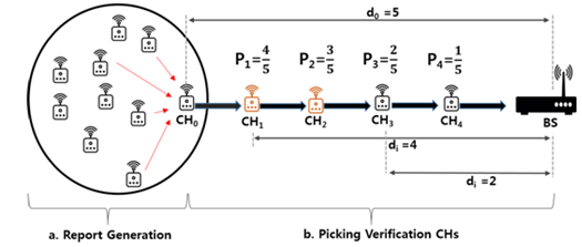 The probabilistic voting-based filtering scheme (PVFS) is a cluster-based application layer security protocol [6]. All member nodes constituting the cluster are assigned a predetermined number in the node placement step, and each node is assigned one key.