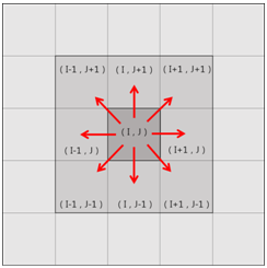 Several techniques and models have been proposed for modeling the spread of forest fires and fires [19],[20],[21],[22].Since our goal is to confirm the spread of fire per unit time, we constructed a simulated environment in a forest fire diffusion model based on cellular automata (CA) for collecting forest fire pattern data. The current CA model is often used as the base simulation model [23],[24], [25].Additionally, a CA-based simulation model for firefighting similar to the simulation environment of the proposed system has been studied [26], [27],[28],[29].CA also called a cell autologue, is a discrete dynamic system devised by American mathematicians Stanislaw Ulam and John von Neumann in the 1940s that has been studied in computational theory, mathematics, physics, complex systems, mathematical biology, and micro structural models. This model is important because it can effectively model real natural phenomena reflecting diverse dynamic phenomena, such as discrete time. The space of cellular automaton, which is the number of cellular automata, is divided into discrete ‘cells.’ Every cellular automaton belonging to each cell consists of a uniform, regular grid with discontinuous variables. Their state at a particular time is determined solely by the variables of each cell, and the variables are influenced by the values of the neighborhood variables of the previous time step. Neighborhood means a cell adjacent to a cell. All cells change simultaneously based on neighboring variables of previous time according to the local rule. Therefore, according to local interaction and neighboring rules, the CA state transition is identified. CA has a Moore method and a von Neumann method. As shown in Figure 3, the Moore method is a method of performing the state transition for each of the eight adjacent cells of the reference cell every step. Alternatively, there is the von Neumann method that considers only four directions of up, down, left, and right.