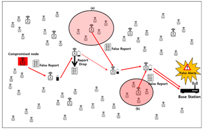 The wireless sensor network (WSN) consists of sensor nodes and a base station (BS) [1], [2]. It is installed and used in various situations, including war situations, home networks, and forest fire monitoring. Sensor nodes are often placed in hard-to-manage locations and are equipped with low-performance CPUs and low-capacity batteries to save network cost. A network attacker who exploits such vulnerability could launch various kinds of attacks such as false report injection attacks or false Message Authentication Code (MAC) injection attacks by compromising nodes. These attacks cause unnecessary energy consumption of the node or cause false alarms at the BS by sending a report about events that did not actually occur [3],[4],[5].Currently, several security protocols are proposed to prevent false report injection attacks. These protocols determine whether the report is authentic or not depending on whether the MAC included in the report is normal or abnormal [6], [7],[8],[9].Even if filtering is not properly performed, the BS may perform the final MAC check. However, in the case of a report that is generated in a cluster where a large number of nodes are compromised, all MACs from the nodes participating in the report generation will have normal values and the report is securely transmitted to the BS. The final MAC check will also consider if it is a legitimate report. The BS sounds a false alarm and responds abnormally, which leads to a high risk. Attacks are becoming increasingly diverse and difficult to detect, and there are security vulnerabilities that rely solely on MACs. As a result, a more intelligent method of security is needed. The proposed scheme is a security model for a false report attack situation in a WSN environment used in forest fire detection with an event prediction model and an evaluation function using a neural network model learned based on report contents. A lot of data is needed to determine the authenticity of the report through the contents received from the nodes. As it is not easy to receive data from the actual field, we use the forest fire state variation model to extract the learning data through the simulation and use it to teach the neural network. Section 2 introduces related research, Section 3 introduces the proposed scheme with an attack scenario, and Section 4 explains the results of the experiment and evaluation of the function’s validity. Finally, Section 5 outlines the conclusions.