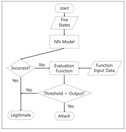 The BS starts counting UT when the fire is started. In the BS, the Map generated from reports received from nodes is added to the neural network model for each actual UT to obtain the predicted UT corresponding to the image of the Map. If both UTs are equal, then the BS considers there is no attack occurring at the corresponding UT. If the two values are different, the function argument values are inserted into the evaluation function to determine whether an attack has occurred in the corresponding UT depending on the output of itself.