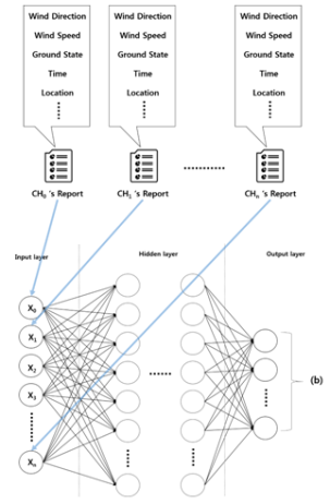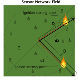 The proposed method is described briefly in this section. Each CH periodically sends a report to the BS about the fire situation. If no report is received from the node, the area can be considered a place where no fire occurred. Since the report contains the location information of each node, the BS can collect the reports and draws a real-time situation map for the fire. The relationship between a normal fire transition and the UT is learned through the artificial neural network based on the Map shown in figure.6. We used simulation data using fire models instead of real fire data for neural network engineering experiments because the actual fire data is costly and time-consuming because it must be actually obtained in the field where the node is installed. The CA-based fire prediction model considers wind direction, wind speed, and field conditions. Based on the CA model based data and the evaluation function, the false report second detection algorithm is completed. Figure.6 is a false report second defense scenario of the proposed system.