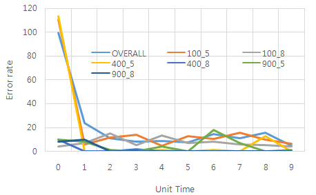 Figure 8 shows the accuracy of the neural network model’s prediction performance in each UT when the number of nodes and wind speed are constant. The prediction model has low accuracy at the start of the fire phase and at the end of the fire spread. The reason that UT has a low accuracy between 0 and 1 is that the range of state transitions that one cell can have when it moves one unit of time from the start point is limited. In addition, it is somewhat difficult to accurately discriminate the UT because the fire progresses to the edge of the field and there is no further progression in the field with a small number of nodes. In this particular off-site UT, we can see that most models have fairly high accuracy.