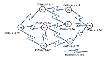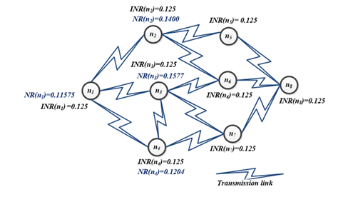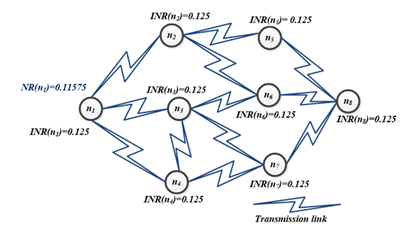 Where INR(ni) is the Initial Node Rank value of node ni. For the given routing example as shown in figure 2, N represents the total number of nodes which is 8. Hence INR (ni) value set to all nodes as 1/8 i.e., 0.125.