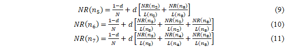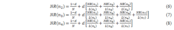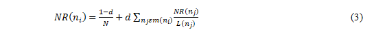 When considering damping factor(d) which can be thought of as the probability of nodes following the links and could regardas the Node Rank distribution from non-directly linked nodes. The generalised Node Rank evaluation is represented as follows