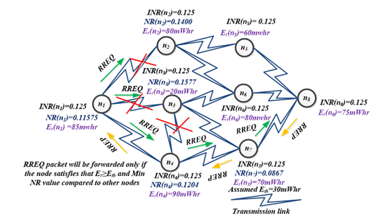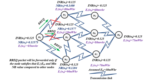 Route Request (RREQ) packet. Before forwarding RREQ to its neighbors source node computes Node Rank values for the related neighbors and then it compares their Er and Node Rank values. The RREQ is forwarded to the neighbors which has high residual energy than the threshold energy (Eth) with less Node Rank value. Otherwise, the RREQ is simply rejected. Assume the threshold energy Eth to be 30mWhr. Though but Node Rank is higher, then the RREQ is not forwarded to that neighbor. Ifand Node Rank is lesser then RREQ is forwarded to the corresponding neighbor node. In case, if Er is less than the Eth, though the Node Rank value is less, the RREQ is rejected. Instead of flooding RREQ, this proposed EENRR algorithm, forwards the RREQ only to its neighbor satisfying the above criteria. Thus the control packets are reduced considerably, minimizing the traffic in the network, which in turn increases the NLT and PDR over the other existing protocols [29].