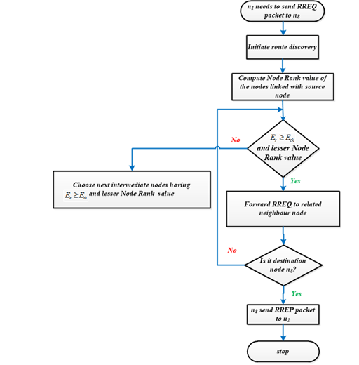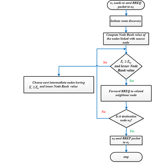 The energy efficient route discovery is initiated by forwarding Route Request (RREQ) packets to its neighbor nodes based on its Node Rank value and Residual Energy (Er). Node Ranks are evaluated only for the neighbor nodes which may have a chance to forward the