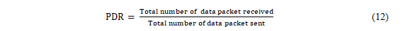 Packet Delivery Ratio (PDR): The ratio of the number of data packets received to that of the number of packets sent as in equation 12.