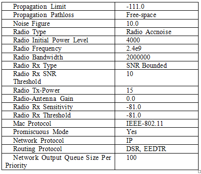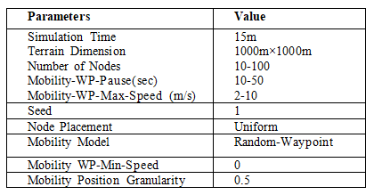 In this EENRR algorithm all works were carried out using GloMoSIM-2.03. The proposed work has experimented with various Ballistic Mobility models such as Uniform and Random Way Point mobility models [28]. As Uniform mobility model is simple, compared to Random Way Point mobility model, the proposed work is experimented only with Random Way Point mobility model. Also, the work assumes that the node’s arrival follows the exponential distribution. The various parameters that were estimated during the simulation are as follows: