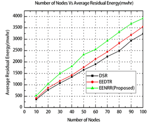 Figure 9 shows the graph between the number of nodes and the average residual energy in mWhr. When the density of the node increases from 10 to 100, the average remaining energy of the nodes in the network is also increased as more number of intermediate nodes is required to transmit the packets in the network. The proposed EENRR algorithm increases the average residual energy by 31.08% over the existing DSR protocol and 21.26% over the existing EEDTR protocol. The proposed EENRR technique chooses lower traffic route, thus it minimizes the control packets considerably over the other protocols. Hence it minimizes the energy consumption and increases the average residual energy of the nodes in the network over the other existing protocols.