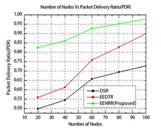 Figure 10 compares the Packet Delivery Ratio of the proposed EENRR algorithm and the existing DSR and EEDTR protocols by varying the number of nodes. The simulation results show the proposed EENRR has increased the PDR value to 45.38% but it is only 28.3% for the existing DSR and EEDTR protocols. This improvement is achieved due to the selection of stable and optimal route by choosing less node rank which minimizes the traffic in the related route. Hence higher PDR is achieved.